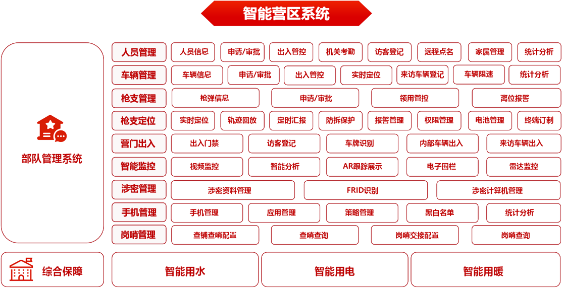 部隊管理系統基于對營區內人、車、dy、崗哨等建設要求,結合軍隊自身特點及應用現狀,實現網絡化管理,提高人、車等管理的效率。可以提高響應能力,構建人、車、q、d、密的全方位綜合管理的部隊系統,保障整體系統高效、穩定、安全運行,提升部隊全面信息化建設層次